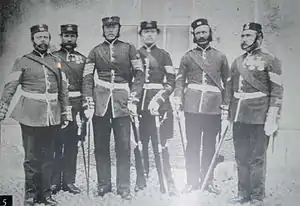 The regiment was deployed to India in 1864 and remained there until 1874 when it returned to England.[3] It was sent to South Africa in 1879 for service in the Anglo-Zulu War and saw action at the Battle of Ulundi in July 1879.[3] It also fought at the Battle of Laing's Nek in January 1881 and the Battle of Majuba Hill in February 1881 during the First Boer War.[3] At the Battle of Laing's Nek it was the last regiment to carry its regimental colours into battle[13] and Lieutenant Alan Richard Hill won the Victoria Cross.[14]