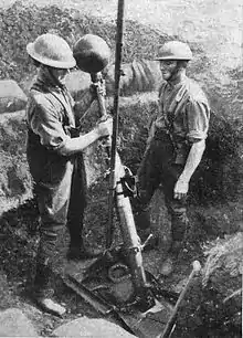 When the German Spring Offensive began on 21 March 1918, 58th's TMBs were positioned on the extreme right of the British line at Chauny and lost all their mortars, although casualties were low.[5][10] Re-equipped, they were in action again at Albert in June, and manned a forward ammunition dump where they came under a German Gas attack. The British Hundred Days Offensive opened on 8 August and the 58th TMBs were in action at Épehy, where they turned captured German Minenwerfers on the enemy with great success. Medium mortars were less useful in mobile warfare, so for the rest of the campaign the TMB men acted as mule drivers for the depleted Divisional Ammunition Column.[5]