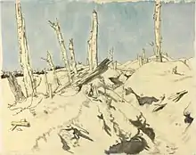 For the next nine months, the 49th Division took part in no major operations but was almost continuously engaged in day-to-day trench warfare, much of it in the Ypres Salient, with the considerable casualties that this entailed.[26] On 19 December, the division received a sudden attack with the new German phosgene gas, followed by heavy shelling, but no serious infantry attack followed.[15][27] In January 1916, the division was withdrawn for its first period of complete rest since it first entered the line.[28]