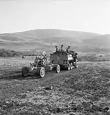10th Armoured Division was reconstituted for the pursuit after Alamein, but 53rd LAA Rgt was no longer with it, having left on 2 November.[105][111] By January 1943 the regiment (with 36 Bofors guns) was in Libya with 2 AA Bde on tasks for XXX Corps.[112] When the North African Campaign ended in May 1943 with the Axis surrender in Tunisia, the regiment was with 12 AA Bde, which had followed Eighth Army's advance for 1,500 miles (2,400 km), supplying mobile AA groups to defend forward landing grounds for the Desert Air Force as they were captured. Bofors guns were frequently employed to 'sweep' with automatic fire when Luftwaffe fighter-bombers attacked out of the sun.[84][113][114][115]