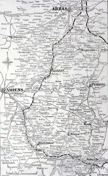 Map of the Spring Offensive; over ten days, the 66th Division retreated from east of Peronne, off the centre right of the map, to outside Amiens, on the centre left.