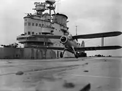 ![]() Fairey Swordfish of 820 Naval Air Squadron passing over HMS Ark Royal in 1939 | |
