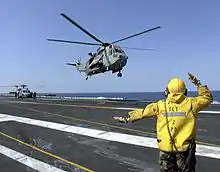 The squadron continues to carry out exercises aboard Royal Navy and Royal Fleet Auxiliary vessels, as well as participating in military operations. It is based at RNAS Culdrose and operates the AgustaWestland Merlin HM.2.[4] Training is performed by 824 NAS and front line duties are shared with 814 NAS. During 2014, 820 NAS was temporarily assigned to the Commando Helicopter Force until the two main troop carrying squadrons fully convert to the Merlin HC.4. 820 NAS has now become the "queens squadron" and will be the main squadron to operate on the Queen Elizabeth class aircraft carrier. [5] 3 Merlins from 820 NAS were deployed off RFA Argus as the UK's response towards the 2014 Ebola virus.[6] 820 NAS will be permanently attached to HMS Queen Elizabeth's air group.[7] On 3 July 2017, a Merlin Mk.2 helicopter of 820 NAS became the first aircraft to land on HMS Queen Elizabeth, piloted by 26-year-old Lieutenant Luke Wraith from Yorkshire.[8]