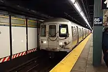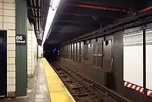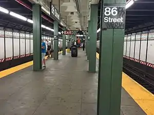 The platform and mezzanines above have dark green columns, and alternate columns have the standard black station name plate with white lettering reading "86 Street".[50][51] The track walls had their mosaic tiling restored as part of the station's 2011 renovation.[52][50] The southern section of the station is where the platform was extended in 1970, and they have no mosaic trims or tiles along the wall, instead including an extension of the tunnel benchwall.[22] The platform has several employee-facilities that have a mosaic trim line.[53]