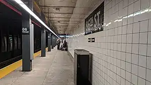 86th Street is a local station on the IND Eighth Avenue Line of the New York City Subway. Located at Central Park West and 86th Street on the Upper West Side, it is served by the B on weekdays, the C train at all times except nights, and the A train during late nights only.