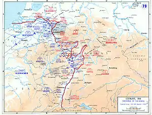 The 89th Infantry Division landed in France at Le Havre, 21 January 1945, and engaged in several weeks of precombat training before moving up to the Sauer River into jump-off positions east of Echternach, 11 March 1945. The next day, the offensive began, and the 89th plunged across the Sauer in a rapid advance to and across the Moselle, 17 March. The offensive rolled on, and the division assaulted across the Rhine River on 26 March 1945 under intense fire in the Wellmich-Oberwesel region. A pontoon bridge was built across the Rhine from St. Goar to St. Goarshausen. In April, the 89th attacked toward Eisenach, taking that town on 6 April. The next objective, Friedrichroda, was secured by 8 April. On 4 April 1945, the 89th overran Ohrdruf, a subcamp of the Buchenwald concentration camp. The division continued to move eastward toward the Mulde River, capturing Zwickau by 17 April. The advance was halted, 23 April, and from then until VE-day, the division saw only limited action, engaging in patrolling and general security. Three towns, Lößnitz, Aue, and Stollberg, were kept under constant pressure, but no attacks were launched.
