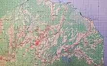 In January 1943 the section was retitled 8th Aust Field Survey Section AIF. In March a sub-section flew into Wau as part of Kanga Force remaining there for more than six months in direct support of the combat troops in the Wau-Bulolo-Salamaua areas. All methods of field survey were used, much based on the urgency of the need: astronomy, triangulation, theodolite and chain traverse, plane-tabling, compass traverse, levelling, trigonometric heighting, barometry, intersection of prominent features behind the enemy to improve artillery targeting. A narrow triangulation chain was carried from the astronomic datum at Wau, north through Bulolo into the Markham Valley in anticipation of the Australian attacks on Japanese held Lae. In October the sub-section was to be relieved and they walked out 110km to the south coast on the Wau-Bulldog road and then by steamer to Port Moresby. After sixteen months of active service 8 Aust Fd Svy Sect was absorbed as No 2 Field Section of 6th Aust Army Topographic Survey Company and moved to Australia.[13][14] On 19 October 1943, General D MacArthur, Commander-in-Chief, South West Pacific Area, highly commended 2/1 Aust Army Topo Svy Coy AIF, 3 Aust Fd Svy Coy AIF, 69th US Engr Topo Coy and 8 Aust Fd Svy Sect AIF for their worthy efforts in supporting the campaigns: Kokoda, Milne Bay, Gona-Sanananda-Buna, Wau-Salamaua, Lae and the Huon Peninsula. "Great technical difficulties were surmounted in producing and distributing maps and photomaps covering more than twelve thousand square miles in time for operations, from combat type photography never before used in this theatre. Astronomic locations vital to the success of the other Allied mapping efforts were obtained under conditions of hardship and grave difficulties of transportation and, upon occasions, considerable risk. This untiring effort to provide the combat units with the maps needed when they were needed, from the material at hand, reflects great credit upon the officers and men of these organisations".[1]