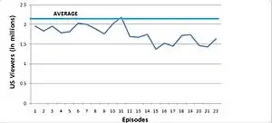 The season premiere was watched by 1.96 million live viewers in the United States and achieved a 0.9 rating in the adults 18–49 demographic, up 22.5% in viewers and 12.5% in demo from the season two finale.[1] Episode 11 achieved season highs in all key demos with a 1.1 adults 18–49 rating, a 1.4 in adults 18–34 and a 2.1 rating in The CW's target demographic of women 18–34. It was also the most watched episode since October, 2009 with 2.18 million viewers tuning in.[11] Episode 15 hit series lows in women 18–34 with a 1.0 rating and matched series lows in adults 18–49 with a 0.7 rating.[15] The season finale scored a 0.8 rating in adults 18–49, which was lifted to a 1.2 rating with a full week of DVR viewing taken into account.[56] The season averaged 1.75 million viewers and a 0.9 rating in adults 18–49. With live+7 day DVR viewing taken into account, it averaged 2.26 million viewers and a 1.2 rating.[57] In the UK episode eight was seen by 548,000 viewers, which was higher than the pilot episode "We're Not in Kansas Anymore".[58] "Best Lei'd Plans" continued upwards with 604,000 viewers becoming the No. 2 rated show on E4 that week.[58]
