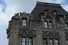 The top three stories consist of a copper-clad mansard roof.[24] There are dormer screens containing small balconies on the 21st floor, while the 22nd and 23rd floors contain dormer windows. These windows are covered by polygonal dormer roofs.[36] Above the 23rd floor is an asphalt roof surface containing mechanical equipment as well as bulkheads.[37] The dormers, as well as decorative tourelles, added to the aesthetic of the building when it was originally viewed from the waterfront.[21]