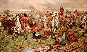The regiment embarked for the continent again in May 1815 for service in the Hundred Days campaign. The regiment had a key role in the Battle of Quatre Bras on 16 June 1815 as one of the regiments defending the disputed crossroads and which later halted a French attack with a bayonet charge.[31] Two days later the regiment was in action again at the Battle of Waterloo. At an early stage, Napoleon's troops attacked the left of the Allied line, and the regiment was ordered to charge the leading French column.[32] The regiment did so and the French column then broke in disorder. The horses of the Scots Greys passed through the regiment to get to the scattering French troops and press the advantage.[33] At this point some members of the regiment clung to the stirrups of the passing Greys so that they could reach the French troops.[34] Corporal Dickson of "F" Troop of the Scots Greys, reported: "They were all Gordons, and as we passed through them they shouted 'Go at them the Greys! Scotland for ever!' My blood thrilled at this and I clutched my sabre tighter. Many of them grasped our stirrups and in the fiercest excitement, dashed with us into the fight."[35] After the battle, the regiment marched to Paris[36] and then embarked for home in December 1815.[37] After arriving in Edinburgh on 7 September 1816, it was cheered by a large crowd.[33]