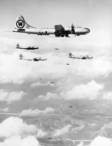 On 17 November 1947, the 92d Bombardment Wing, Very Heavy was organized at Spokane Army Air Field, Washington [3] as part of the United States Air Force's wing base reorganization, in which combat groups and all supporting units on a base were assigned to a single wing.[5] The 92d Bombardment Group, flying Boeing B-29 Superfortresses became its operational component.[3] It served as a double-sized B-29 wing until April 1950, and again from May 1950 to April 1951, although one bomb group was generally deployed overseas for training or combat in Korea. It also supervised the 454th Bombardment Group,[3] a Reserve corollary bomb group from June 1949 until February 1951, when the 454th was called to active duty for the Korean War.[6]