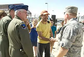 ![]() Robert Downey Jr. shakes hands with Col. Jerry Gandy, commander of the 95th Air Base Wing during the filming of Iron Man 2 at Edwards Air Force Base | |