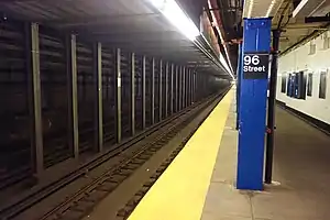 The platforms have no trim line, but name tablets read "96TH ST." in white sans-serif font on a midnight blue background and black border. "96" signs in the same format as the directional signs run along the platform walls at regular intervals at the same level as the name tablets. Blue columns run along both platforms at regular intervals with alternating ones having the standard black station name plate in white numbering.