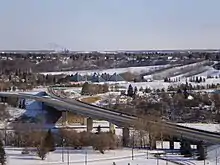 The City of Edmonton commissioned the 1963 Metro Edmonton Transportation Study (METS) to address the need for free-flow traffic corridors and more river crossings in the downtown area. The plan proposed a downtown freeway loop with feeder routes, including an eastern approach via 98 Avenue, a southern approach via the Mill Creek Ravine which would continue north across the river and continue north parallel to 95 Street, and a western approach via the MacKinnon Ravine and 100 Avenue. The eastern and southern approaches would be connected to the western approach via the south leg of the freeway loop, which cross the river near the Low Level Bridge and follow River Valley Road, along with a new arterial roadway via 97 Avenue.[8] In the late 1960s and early 1970s, road improvement projects outside downtown had connections to the 98 Avenue approach in mind. A major interchange at Highway 16 and Highway 16A (present-day Yellowhead Trail and Anthony Henday Drive) opened in 1971 and an interchange at Highway 16A and Highway 14X (present-day Anthony Henday Drive and Baseline Road, respectively) opened in 1975, featuring grading for a future eastbound to northbound flyover that was ultimately not constructed, the grading was removed when Anthony Henday Drive was reconstructed in the late 2010s.[9][10] As the residential neighbourhoods in eastern Edmonton were developed, Terrace Road was constructed to allow for continuous movement between Highway 16A east and 98 Avenue. The freeway proposal through the North Saskatchewan River valley and its feeder ravines proved to be very controversial, with public protests suspending construction shortly after clearing work had begun in the MacKinnon Ravine. In tandem with cost overruns, the majority of project was cancelled in 1974;[11][12] however, remnants of the larger project which were constructed include the interchange with Connors Road, the James MacDonald Bridge, and the tunnel underneath the Alberta Legislature grounds.