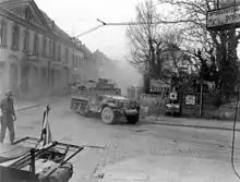 The 9th Armored Division landed in Normandy late in September 1944, and first went into line, 23 October 1944, on patrol duty in a quiet sector along the Luxembourg-German frontier. When the Germans launched their winter offensive on 16 December 1944, the 9th, with no real combat experience, suddenly found itself engaged in heavy fighting. The Division saw its severest action at St. Vith, Echternach, and Bastogne, its units fighting in widely separated areas. Its stand at Bastogne held off the Germans long enough to enable the 101st Airborne Division to dig in for a defense of the city. After a rest period in January 1945, the Division prepared to drive across the Roer River. The offensive was launched on 28 February 1945 and the 9th crossed the Roer to Rheinbach, sending patrols into Remagen. On 7 March 1945, elements of the 9th Armored found that the Ludendorff Bridge was still standing. When German demolition charges failed to bring the bridge down, they crossed it, disarming and removing the remaining charges, which could have exploded at any time. The Division exploited the bridgehead, moving south and east across the Lahn River toward Limburg, where thousands of Allied prisoners were liberated from Stalag XIIA. The Division drove on to Frankfurt and then turned to assist in the closing of the Ruhr Pocket. In April it continued east, encircling Leipzig and securing a line along the Mulde River. The Division was shifting south to Czechoslovakia when the war in Europe ended on 9 May 1945.[3]