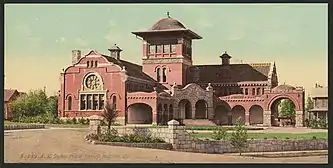 The A. K. Smiley Public Library is a public library located at 125 W. Vine St. in Redlands, California. Built in 1898, the library was donated to Redlands by philanthropist Albert K. Smiley. Architect T. R. Griffith designed the library in a style which has alternately been described as Mission Revival and Moorish Revival and includes a variety of elements from additional styles. The building has a tile roof and parapets topping arcades on its sides, which suggest a Mission Revival influence; however, the battlement and the curves in the parapet are Moorish Revival elements. In addition, elements of the arches in the arcade, the windows, and the roof ridge were borrowed from classical, Gothic, Spanish Romanesque, and Oriental themens. The library still serves as the Redlands public library. In addition, it houses a collection of materials on native tribes in California donated by Andrew Carnegie, as well as a collection of rare materials about Southern California and local history.[3]