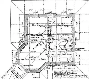 A detailed drawing of the building plans for the second floor of the model fireproof farm house, now known as the Stone House at Rock Lodge Club, from Himmelwright's book. (Click image to enlarge.)"Twenty to fifty years ago when timber was abundant and the best only was selected for building purposes, much more durable houses were built than at present. Large sized and heavy pieces were used for the framing and the beams. These were frequently hewn by hand, so as to utilize the heart which is the best and most durable part of the timber.