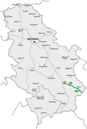 Motorway begins at Trupale interchange near Niš, at the junction with A1 motorway and runs eastward, to the Gradina border crossing with Bulgaria, near Dimitrovgrad. The motorway is part of the Pan-European corridor X and is planned to be connected with the Bulgarian Europe motorway that will run to Sofia.