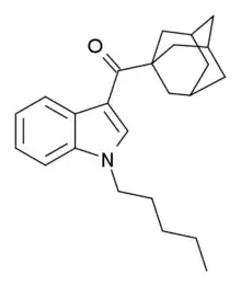 AB-001 (1-pentyl-3-(1-adamantoyl)indole) is a designer drug that was found as an ingredient in synthetic cannabis smoking blends in Ireland in 2010 and Hungary and Germany in 2011.[1][2][3] It is unclear who AB-001 was originally developed by, but it is structurally related to compounds such as AM-1248 and its corresponding 1-(tetrahydropyran-4-ylmethyl) analogue, which are known to be potent cannabinoid agonists with moderate to high selectivity for CB2 over CB1.[4][5] The first published synthesis and pharmacological evaluation of AB-001 revealed that it acts as a full agonist at CB1 (EC50 = 35 nM) and CB2 receptors (EC50 = 48 nM).[6] However, AB-001 was found to possess only weak cannabimimetic effects in rats at doses up to 30 mg/kg, making it less potent than the carboxamide analogue APICA, which possesses potent cannabimimetic activity at doses of 3 mg/kg.[6]