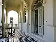The arcade has paired timber-panelled entrance doors with sidelights and an arched fanlight containing etched glass and leadlight panels. The entrance is flanked by two casement windows with arched headers to either side, all of which have expressed imposts, extrados and keystones. The arcade has arches at either end, with two cross arches framing the entrance. The floor of the arcade has diagonally-laid black-and-white marble tiles, the ceiling is boarded, and the rendered wall is scribed to imitate coursing.[1]