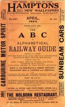 The guide's slogan was "Easy as ABC",[4] reflecting its alphabetical listings that made it much easier to use than its competitor Bradshaw's Guide which was notoriously difficult to understand, requiring "the patience of a chess player and the ingenuity of a crossword puzzle addict".[5] Oscar Wilde is said to have observed that he would "sooner lose a train by the ABC than catch it by Bradshaw".[6]