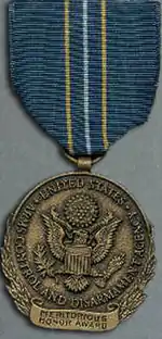The Meritorious Honor Award is an award of the United States Arms Control and Disarmament Agency, an independent agency charged with implementing and verifying arms control strategies which has since been merged into the Department of State. Similar versions of the same award exist for the United States Agency for International Development, the Department of State, and the former U.S. Information Agency. This award has been replaced with the State Department's Meritorious Honor Award. This award was presented to groups or individuals in recognition of a special act or service or sustained outstanding performance.