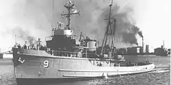 ARA Alférez Sobral (A-9) is an 800-ton ocean-going tug[1] that was in service with the Argentine Navy from 1972 until 2019, where she was classified as an aviso.[2] She had previously served in the US Navy as the fleet tug USS Salish (ATA-187). In Argentine service an aviso is a small naval vessel used for a number of auxiliary tasks, including tugging, laying buoys, and replenishing other ships, lighthouses and naval bases.[3]