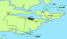 The destroyer lost her Lynx helicopter on 4 May when the aircraft hit her flight-deck as the Argentine fleet was redeploying.[16] She spent the next few days in dry dock to repair the mechanical problems which reduced her speed during the operations of 1 May.[13] in the following weeks, Santísima Trinidad was engaged in patrol duties off Patagonia.[17] During the Air Force attacks on Bluff Cove on 8 June, Santísima Trinidad played a key role by jamming the frequencies used by the Sea Harriers air controllers with interference signals.[18] Once the end of hostilities was declared, Santísima Trinidad escorted the British transport Canberra into Puerto Madryn with about 3,000 Argentine prisoners on board.[17]