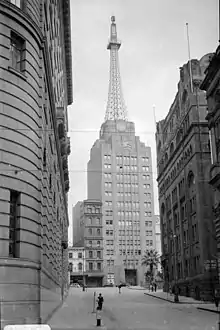 The AWA Tower was designed by architects Morrow and Gordon from 1937–1939 and became one of the most notable commercial buildings of Sydney. It brought geometric Art Deco design and modernism to the city skyline with polished trachyte facing at ground level intending to signal a progressive and go-ahead firm. The 1939 steel-framed brick building was designed by Robertson, Marks and McCredie. The tower was modelled on Berlin's Funkturm Tower, built a few years earlier, and both took inspiration from the Eiffel Tower in Paris.[2] The communications tower was an integral part of the structure and remained the tallest structure in Sydney (other than the Sydney Harbour Bridge) until the 1960s.[1] The tower is 46 metres (151 ft) high atop a 55-metre (180 ft) high building. The tower was 48 metres (157 ft), and at the 97-metre (318 ft) point of the building there was a viewing platform.
