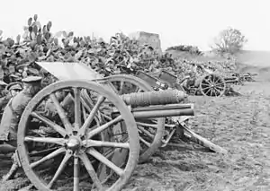 The battery rejoined the division on 13 December, but on 20 December it entrained at Alexandria for the Western Desert, concentrating at Mersa Matruh on 7 January 1916.[18] Thereafter, it served as part of the Western Frontier Force in the Senussi Campaign, taking part in the Affair at Halazin (23 January 1916).[19] The battery returned to Alexandria on 6 March and was rearmed with four 18 pounders. It returned to the Suez Canal Defences on 6 April and rejoined the 8th Mounted Brigade (the redesignated London Mounted Brigade). The brigade left for Salonika in November without the battery which joined the Australian 4th Light Horse Brigade when it was reformed in February 1917.[18] It remained attached to the 4th ALH Brigade for the rest of the war.[20]