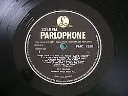 Side one of the LP contains the songs from the film soundtrack. Side two contains songs written for, but not included in, the film, although a 1980s re-release of the film includes a prologue before the opening credits with "I'll Cry Instead" on the soundtrack.[9] The title of the album and film was the accidental creation of drummer Ringo Starr.[10] According to Lennon in a 1980 interview with Playboy magazine: "I was going home in the car and [film director] Dick Lester suggested the title, 'Hard Day's Night' from something Ringo had said. I had used it in In His Own Write, but it was an off-the-cuff remark by Ringo. You know, one of those malapropisms. A Ringo-ism, where he said it not to be funny ... just said it. So Dick Lester said, 'We are going to use that title.'"[11]