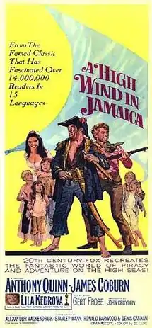 A High Wind in Jamaica is a 1965 DeLuxe Color film, based on the Richard Hughes novel of the same name, and directed by Alexander Mackendrick[2] for the 20th Century-Fox studio. It stars Anthony Quinn and James Coburn as the pirates who capture five children. Other cast members include Deborah Baxter, Nigel Davenport, Isabel Dean, Lila Kedrova, Kenneth J. Warren, and Gert Frobe. One of the child actors is the author Martin Amis.