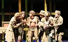 The aesthetics scholar David Marshall draws out this theme even further by noting that the loss of identity reaches its fullness in the description of the mechanicals and their assumption of other identities. In describing the occupations of the acting troupe, he writes "Two construct or put together, two mend and repair, one weaves and one sews. All join together what is apart or mend what has been rent, broken, or sundered."[19] In Marshall's opinion, this loss of individual identity not only blurs specificities, it creates new identities found in community, which Marshall points out may lead to some understanding of Shakespeare's opinions on love and marriage. Further, the mechanicals understand this theme as they take on their individual parts for a corporate performance of Pyramus and Thisbe. Marshall remarks that "To be an actor is to double and divide oneself, to discover oneself in two parts: both oneself and not oneself, both the part and not the part."[19] He claims that the mechanicals understand this and that each character, particularly among the lovers, has a sense of laying down individual identity for the greater benefit of the group or pairing. It seems that a desire to lose one's individuality and find identity in the love of another is what quietly moves the events of A Midsummer Night's Dream. As the primary sense of motivation, this desire is reflected even in the scenery depictions and the story's overall mood.[19]