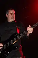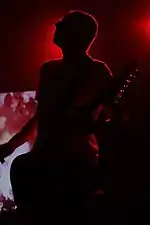 When the tour picked back up in December after the release of A World Lit Only by Fire, the majority of the set lists were taken up with new songs.[57] This trend continued through 2015, with Godflesh performing half the album per concert.[58][24] For the shows in support of A World Lit Only by Fire, Green and Broadrick played over preprogrammed drum machine loops, and apocalyptic imagery was projected onto a backdrop.[54] As he did on the album, Broadrick performed with an eight-string guitar.[59]