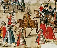 In 1599, Abbas sent his first diplomatic mission to Europe.[111] The group crossed the Caspian Sea and spent the winter in Moscow, before proceeding through Norway, Germany (where it was received by Emperor Rudolf II) to Rome where Pope Clement VIII gave the travellers a long audience. They finally arrived at the court of Philip III of Spain in 1602.[112] Although the expedition never managed to return to Iran, being shipwrecked on the journey around Africa, it marked an important new step in contacts between Iran and Europe and Europeans began to be fascinated by the Iranians and their culture – Shakespeare's 1601–02 Twelfth Night, for example, makes two references (at II.5 and III.4) to 'the Sophy', then the English term for the Shahs of Iran.[113][114] Persian fashions—such as shoes with heels, for men—were enthusiastically adopted by European aristocrats.[54] Henceforward, the number of diplomatic missions to and fro greatly increased.[115]