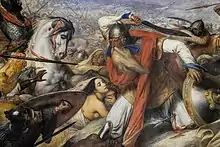![]() Abdul Rahman Al Ghafiqi (right) is depicted in Charles de Steuben's Bataille de Poitiers en Octobre 732 facing Charles Martel (mounted) at the Battle of Tours. | |