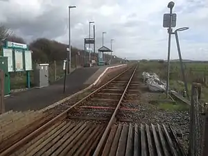 It was upgraded in 1933 to station status but in 1956 reverted to an unstaffed halt. The station was host to a GWR camp coach from 1936 to 1939.[2][3] From 1952 to 1964 there was a British Railways Camping coach located in the small siding on the northern side of the railway line; on the right-hand (west) side of the level-crossing when approaching the beach. The single-carriage Camping Coach was usually only located here during the summer months and would be rented out to families for holidaying purposes. Timber access stairways were provided to the coach from the side away from the railway line as there was no permanent platform associated with this siding.[4]