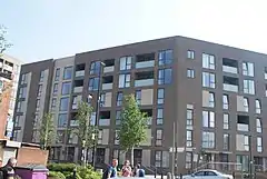 The new homes are arranged around this linear green space in medium rise, high density buildings ranging from four to ten storeys. Lower, more domestic scale buildings sit adjacent to the neighbouring estate, whilst higher, muscular, robust buildings along the A13 provide a degree of protection to this urban edge.[2][8]
