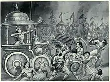 On the 13th day of the war, Arjuna was diverted to South by Susharma and Trigartas. Taking advantage of his absence, Duryodhana and his allies made a plan to trap Yudhisthira so that the war can be stopped easily and without losing much army The army of Kauravas, under Dronacharya, formed Chakravyuha. Abhimanyu knew how to enter it but didn't know how to exit. He went into the trap followed by his paternal uncles. Near the edges of the Charavyuha, Abhimanyu ends up killing Laxmana, the son of Duryodhana. Outraged by the killing of his son, Duryodhana orders Dronacharya to change the plan into killing Abhimanyu, but Abhimanyu was followed by the remaining four pandavas. However the four Pandavas were stopped by Jayadratha. Jayadratha defeated all four of them, Drupada too was stopped and trapped. Ashwathama and Kritavarma defeated Dhrishtadyumna and the Upapandavas, leaving Abhimanyu all alone. Before reaching the center, Abhimanyu killed many other warriors like Rukhmartha, Brihadbala, Shon, etc. After Abhimanyu reached the centre of the trap, he was attacked by Drona, Dushasana, Ashwatthama, Karna, Shakuni, Duryodhana Kripa, Kritavarma Vrishasena and Drumasena (Dushasana's son), and many other warriors at a same time, which was against the rules of the war.[7]