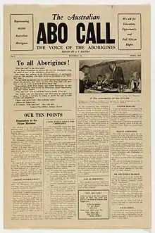 The Australian Abo Call was the first Aboriginal-focused publication printed in Australia.[1] There were a total of six issues, all published in 1938.[2] It was written and edited by John (Jack) Patten, co-founder of the Aborigines Progressive Association and featured news gathered by Patten on his travels through eastern Australia, and from correspondents nationwide.[3] The newspaper's tagline was "The Voice of the Aborigines".