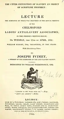 Antislavery sentiment may have grown in the British Isles in the first few years after the Somersett case. In 1774, influenced by the case and by the writings of Quaker abolitionist Anthony Benezet, John Wesley, the leader of the Methodist tendency in the Church of England, published Thoughts Upon Slavery, in which he passionately criticized the practice.[18] In his 1776 A Dissertation on the Duty of Mercy and Sin of Cruelty to Brute Animals, the clergyman Humphry Primatt wrote, "the white man (notwithstanding the barbarity of custom and prejudice), can have no right, by virtue of his colour, to enslave and tyrannize over a black man."[19] In 1781 the Dublin Universal Free Debating Society challenged its members to consider if "enslaving the Negro race [is] justifiable on principles of humanity of [sic] policy?"[20]