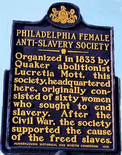 The abolitionist movement began about the time of the United States' independence. Quakers played a big role. The first abolition organization was the Pennsylvania Abolition Society, which first met in 1775; Benjamin Franklin was its president.[64] The New York Manumission Society was founded in 1785 by powerful politicians: John Jay, Alexander Hamilton, and Aaron Burr.