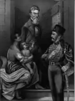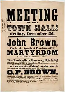 Historian Frederick Blue called John Brown "the most controversial of all 19th-century Americans".[55] When Brown was hanged after his attempt to start a slave rebellion in 1859, church bells rang across the North, there was a 100-gun salute in Albany, New York, large memorial meetings took place throughout the North, and famous writers such as Ralph Waldo Emerson and Henry David Thoreau joined other Northerners in praising Brown.[56] Whereas Garrison was a pacifist, Brown believed violence was unfortunately necessary to end slavery.