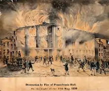Anti-slavery advocates were outraged by the murder on 7 November 1837 of Elijah Parish Lovejoy, a white man and editor of an abolitionist newspaper, by a pro-slavery mob in Illinois. This was soon followed by the destruction by arson, three days after it opened, of abolition's great new building, Pennsylvania Hall. Except for the burning of the Capitol and the White House by the British during the War of 1812, it was the worst case of arson in the country up to that date. Fire companies were prevented by violence from saving the building.