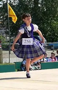 The aboyne dress is the name given to the prescribed attire for female dancers in the Scottish national dances, such as the Flora MacDonald's fancy, the Scottish lilt, and others. Male dancers wear the kilt for these dances, the kilt being a male garment. There are two versions of the aboyne dress in use. Some consider the aboyne as quite suited to the graceful movements of the National dances.[1]