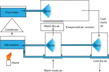 Another variant, uses air, water, and a salt water solution. The intake of warm, moist air is passed through a sprayed solution of salt water. The spray lowers the humidity but does not significantly change the temperature. The less humid, warm air is then passed through an evaporative cooler, consisting of a spray of fresh water, which cools and re-humidifies the air. Humidity is removed from the cooled air with another spray of salt solution, providing the outlet of cool, dry air.