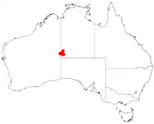 It is endemic to a small area of arid central Australia extending from around Anne Range and Bloods Range in the west to the Petermann Range in the east where it is commonly situated on quartzite scree slopes growing in skeletal soils as a part of open shrubland communities dominated by spinifex.