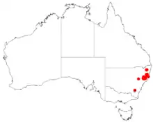 The shrub is found in north eastern New South Wales and is commonly located in the Great Dividing Range from Gibraltar Range National Park in the north down to Barrington Tops National Park in the south where it is often situated around creeks and among or along the edges of swamps growing in granite or basalt based soils as a part of Eucalyptus woodland communities.[3]