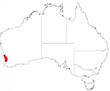 It is endemic to the west of Western Australia from around Dandaragan in the north[1] to around Subiaco in the south and is commonly found on limestone breakaways.[2]