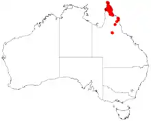 It is endemic to the northern part of Cape York Peninsula where it is quite common. It is found in deep sandy soils usually along creeks and rivers in scrubland communities often with Melaleuca viridiflora.[1]